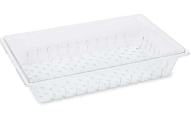 - Rubbermaid Commercial Colander/Drain Tray/Tote Box is a clear, break-resistant tray.